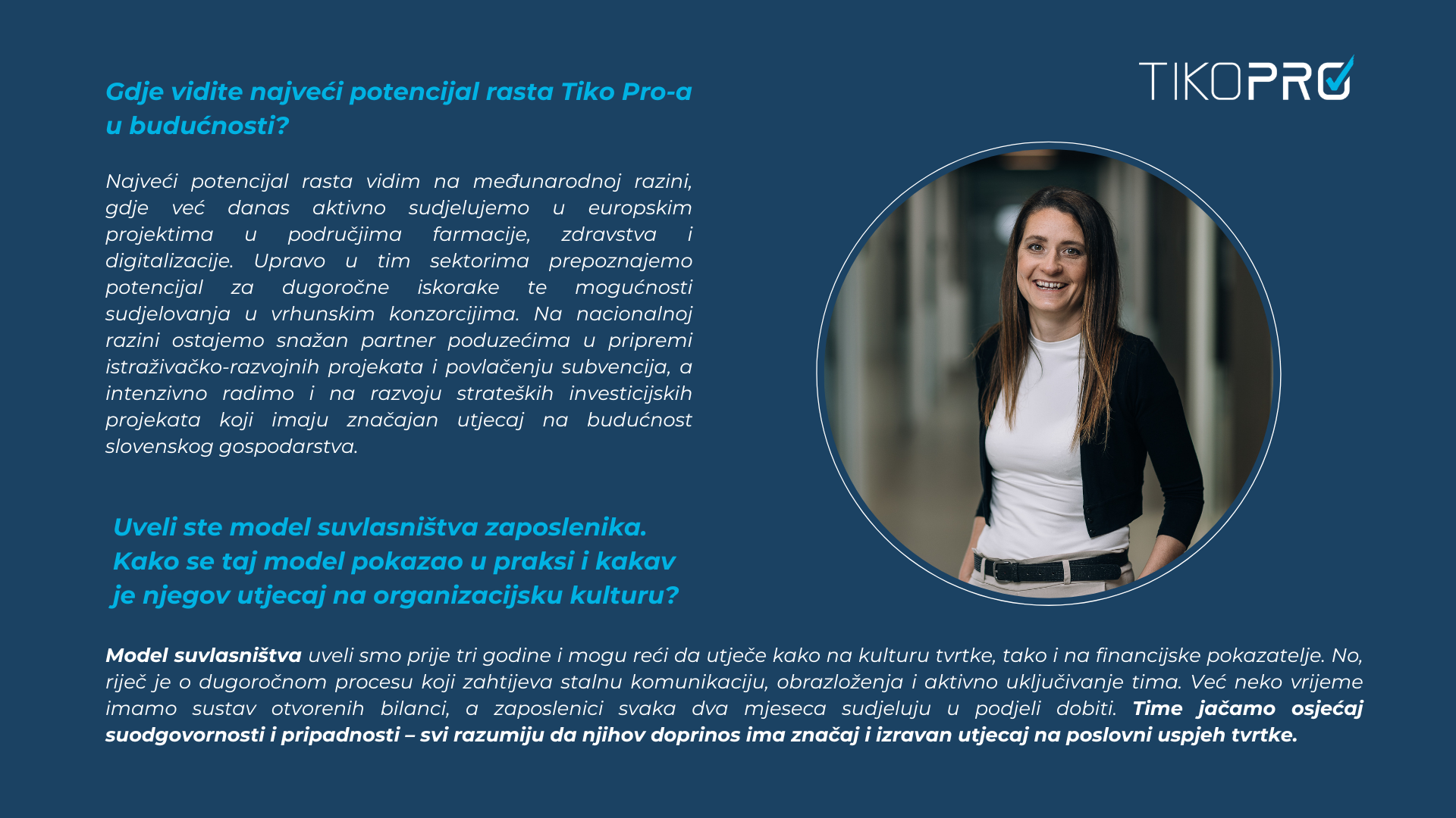 Na razvojnom putu bilo je mnogo važnih trenutaka, no oni koji su tvrtku najviše oblikovali bili su upravo oni najzahtjevniji – kada je bilo potrebno napraviti iskorak, donijeti hrabru odluku i zakoračiti u nepoznato. Među takvima, osnivačica posebno ističe uvođenje modela suvlasništva zaposlenika, izlazak na međunarodno tržište te prvu ozbiljnu suradnju s United Group, kojom je Tiko Pro potvrdio svoju stručnost i na najzahtjevnijoj europskoj razini.