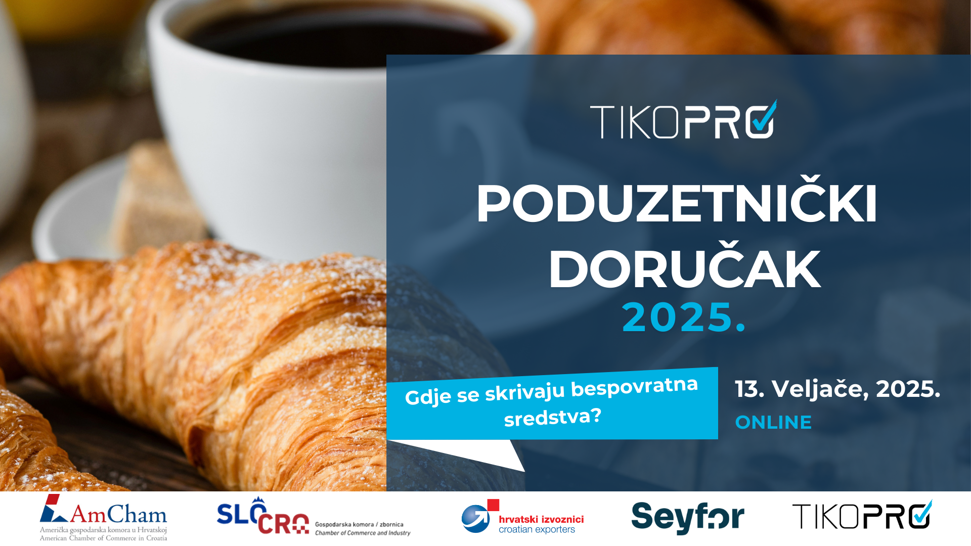 Tiko Pro Poduzetnički doručak: Gdje se skrivaju bespovratna sredstva u 2025. godini? S velikom radošću najavljujemo naš tradicionalni online Poduzetnički doručak koji svake godine privlači sve više sudionika. Zato vas i ove godine pozivamo na besplatni online događaj u 2025. godini! Datum objave: 8. 01. 2025 Tiko Pro Poduzetnički doručak: Gdje se skrivaju bespovratna sredstva u 2025. godini? 📅 Datum: 13. veljače 2025. ⏰ Vrijeme: 09:30 📍 Lokacija: Online (ZOOM) PRIJAVA S velikom radošću najavljujemo naš tradicionalni online Poduzetnički doručak koji svake godine privlači sve više sudionika. Zato vas i ove godine pozivamo na besplatni online događaj u 2025. godini! Što možete očekivati? Pregled aktualnih i najavljenih natječaja u Hrvatskoj Puno korisnih informacija i zanimljivih tema koje smo pripremili samo za vas PROGRAM 9:30 – 9:35 Uvod i pozdravni govor 9:35 – 9:55 Bespovratna sredstva u 2025. – osnovni uvjeti i prihvatljivost Sandra Golob, voditeljica projekata Tiko Pro d.o.o. 9:55 – 10:15 Inovativna ideja – kako do sredstva? Lana Labinjan, voditeljica projekata Tiko Pro d.o.o. 10:15 – 10:35 Povratna sredstva i Zakon o poticanju ulaganja Karmen Španjol, voditeljica projekata Tiko Pro d.o.o. 10:35 – 10:50 Prilike za poduzetnike na EU programima (na engleskom) < Matej Tisaj, voditelj prodaje EU, Tiko Pro d.o.o. Ako je suditi po dosadašnjem interesu, mjesta će se brzo popuniti, zato ne čekajte – prijavite se već danas i osigurajte svoje mjesto! Radujemo se vašem prisustvu! 😊 Trebate li našu pomoć prilikom pridobivanja sredstava? Pošaljite nam upit i porazgovarati ćemo o mogućnostima suradnje. Kontaktirajte nas Prethodna TOP prilike za EU financiranje (besplatna brošura) Sljedeća TOP prilike za EU financiranje (besplatna brošura) Sve novosti